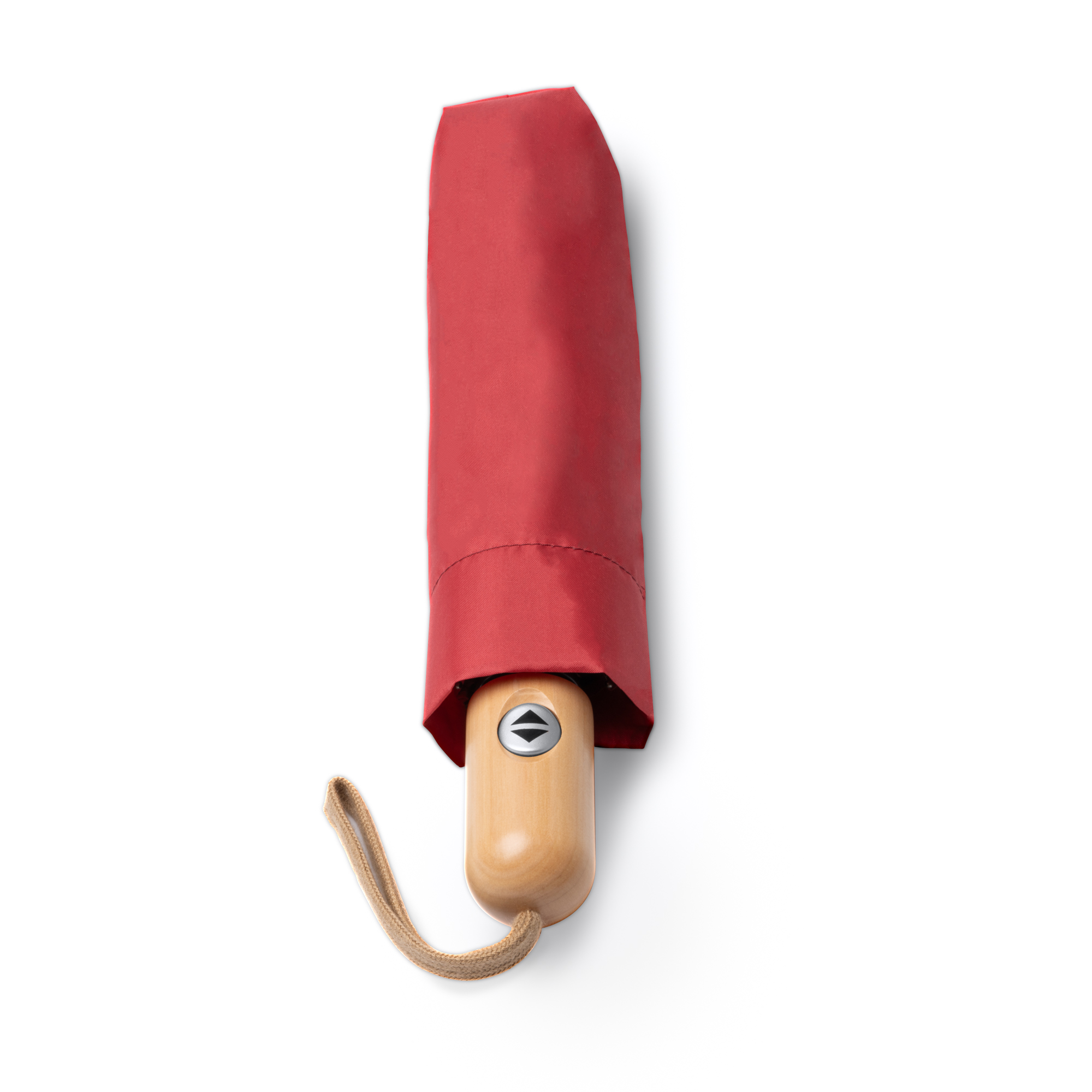 Paraguas plegable de apertura y cierre automático. Tejido RPET pongee 190T antiviento con funda a juego. Mango de bambú y cuerda de algodón.