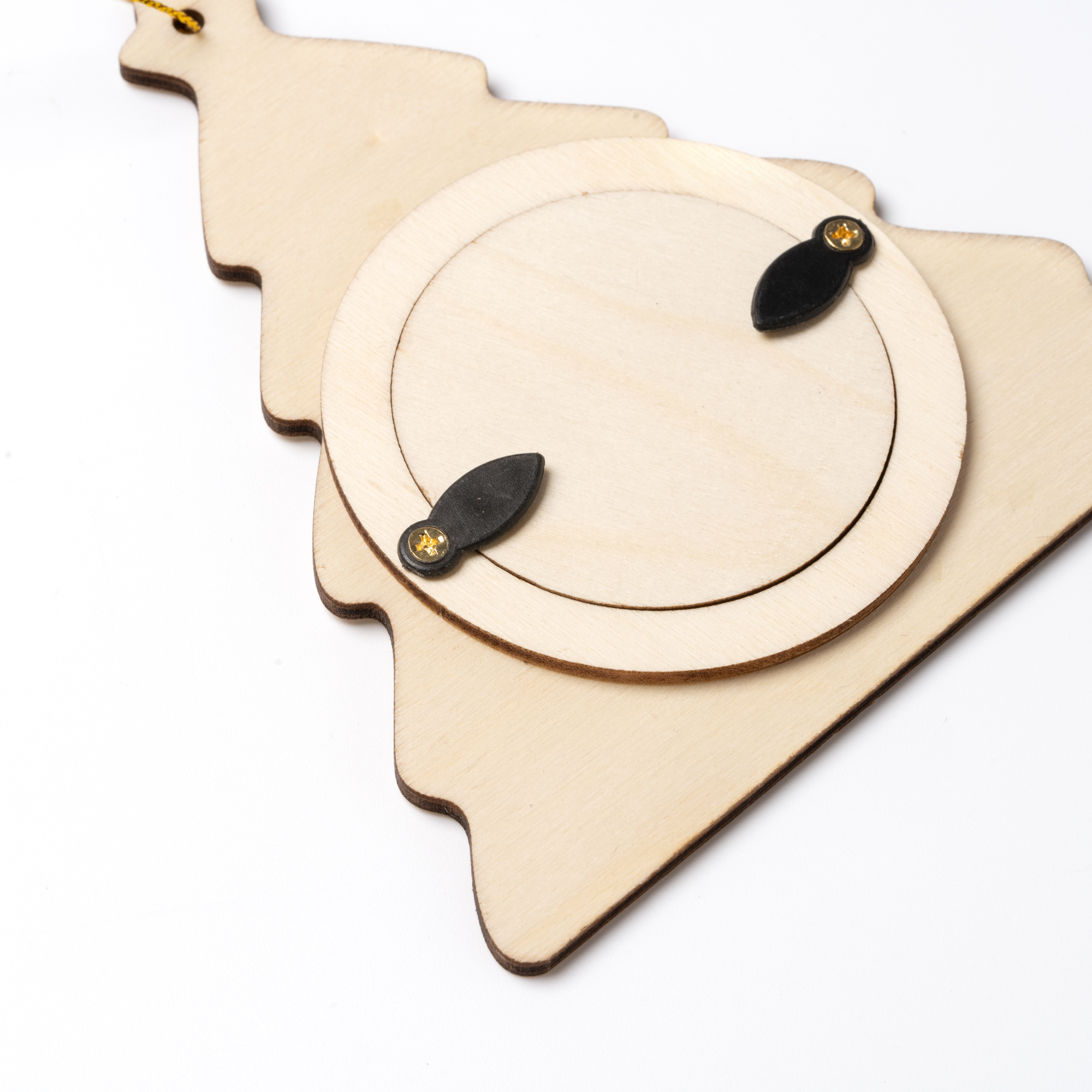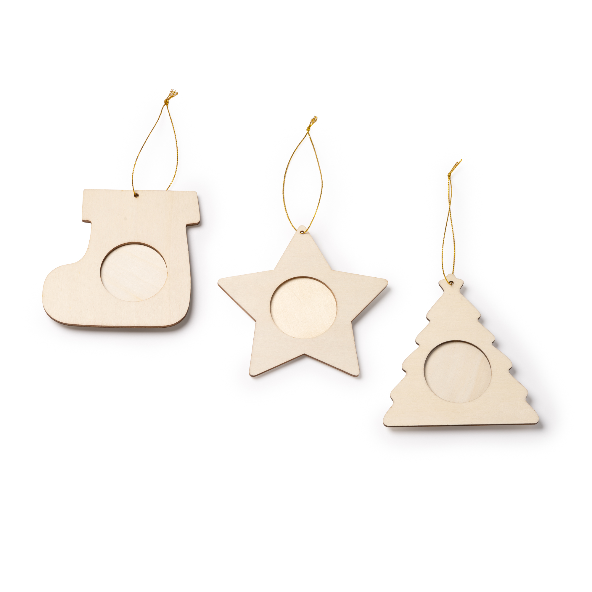 Adorno portafotos navideño de madera con capacidad para fotos de 4,5 cm de diámetro. Perfecto para añadir un toque personalizado y festivo a la decoración durante las fiestas.