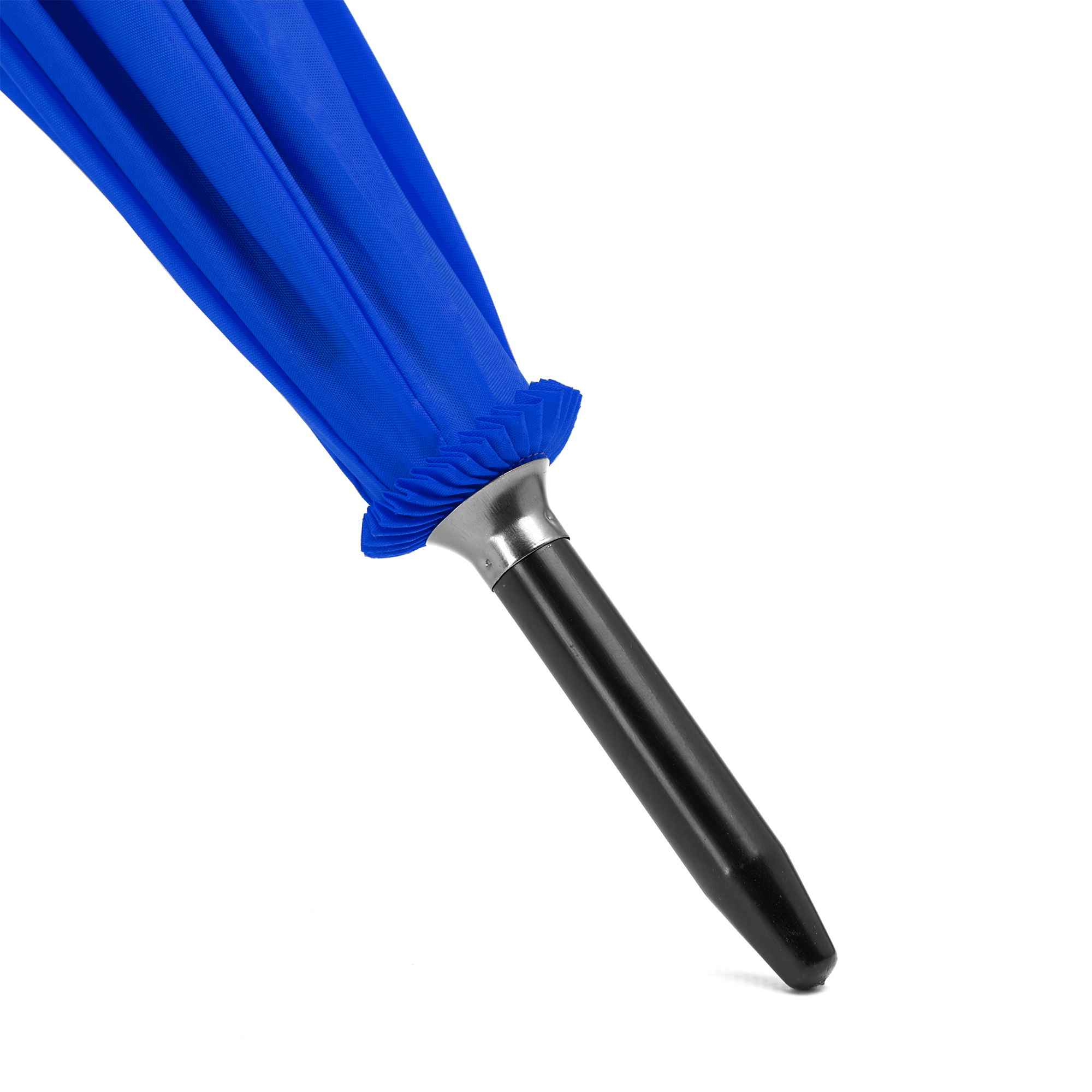 Paraguas XL con mango, bastón y terminaciones en negro. Cuenta con varillas largas de fibra de vidrio y botón de apertura automática. Mango recto de goma EVA, lo que proporciona comodidad en el agarre. Con cierre con velcro en color a juego con la tela del paraguas. Diámetro 130, que lo dota de amplitud extra.
