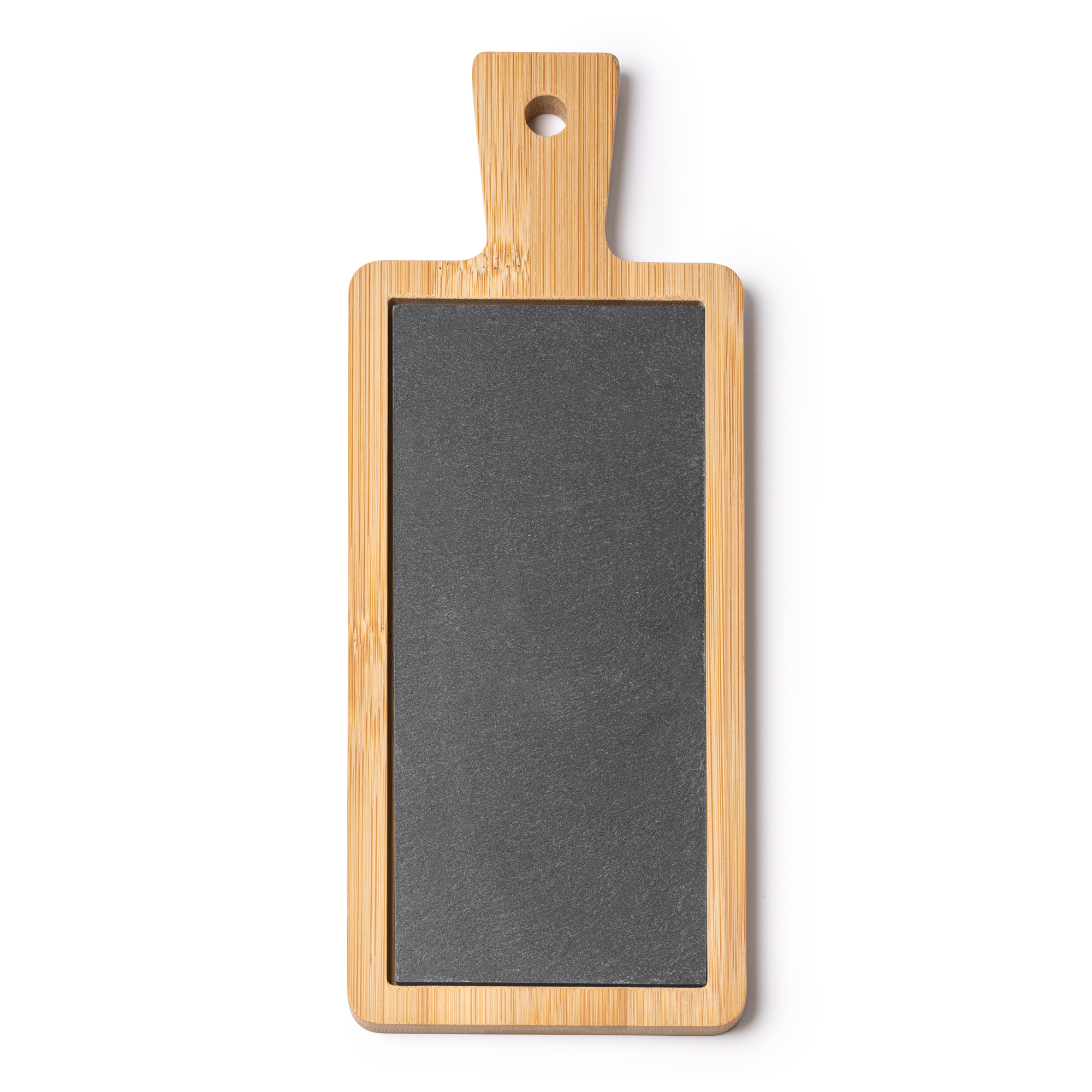 Tabla de cortar de bambú y pizarra es una opción elegante y funcional para tu cocina, pudiendo presentar los alimentos en la bandeja extraíble de pizarra. Este diseño combina la durabilidad de la pizarra con la naturalidad y sostenibilidad del bambú. Cuenta con un mango de agarre cómodo en el extremo.