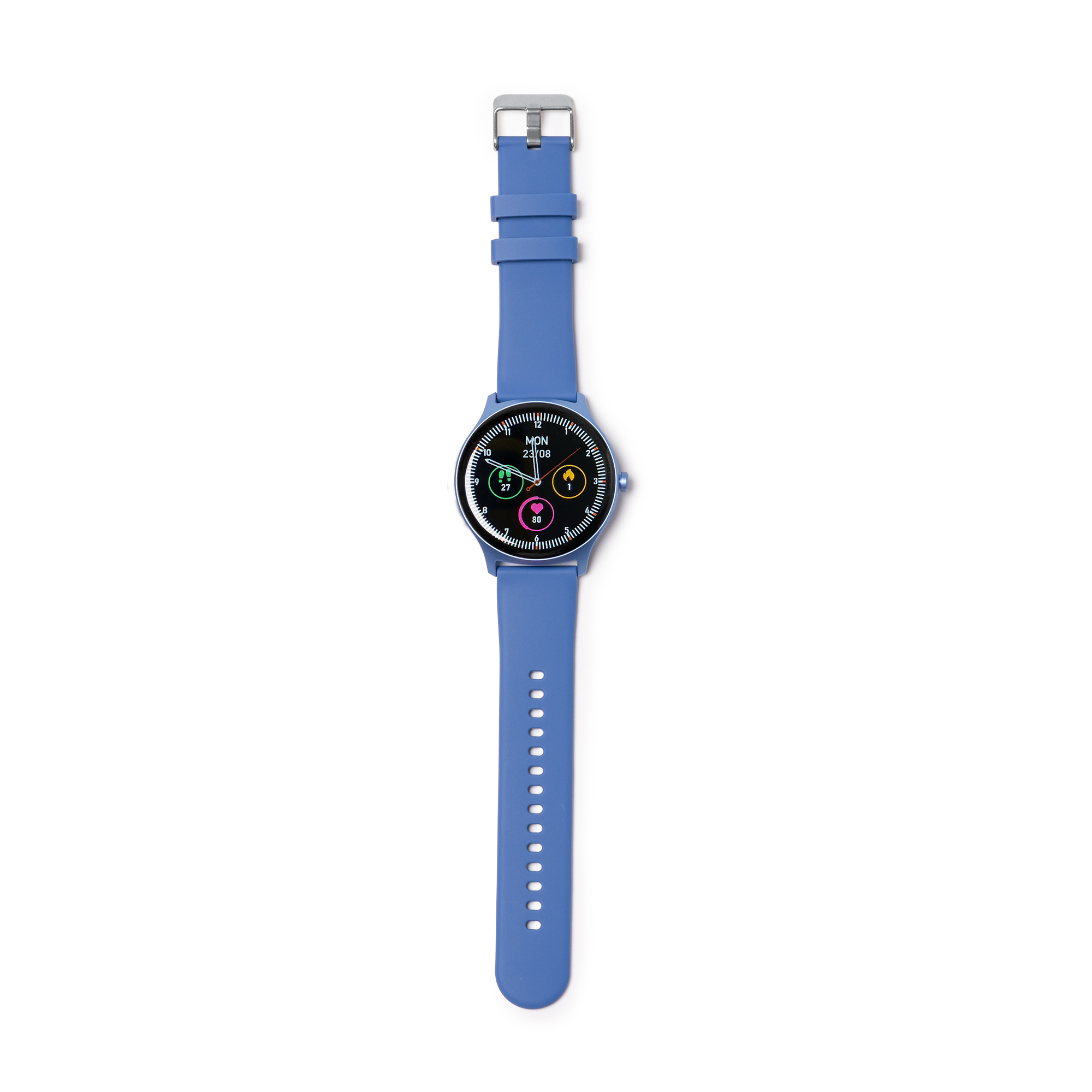 El reloj inteligente con funciones de actividad, con esfera metalizada y correa de silicona. Con pantalla táctil IPS de 1,39 pulgadas y con función de llamadas, mediante conexión Bluetooth, control para responder, colgar, marcar o acceder al historial de llamadas mediante sus botones multifunción. También cuenta con funciones de medición de ritmo cardíaco, presión arterial, monitorización de deporte, pasos diarios, reproducción de música, asistente de voz y notificación de aplicaciones, entre otras. Conexión mediante app compatible con iOS y Android.