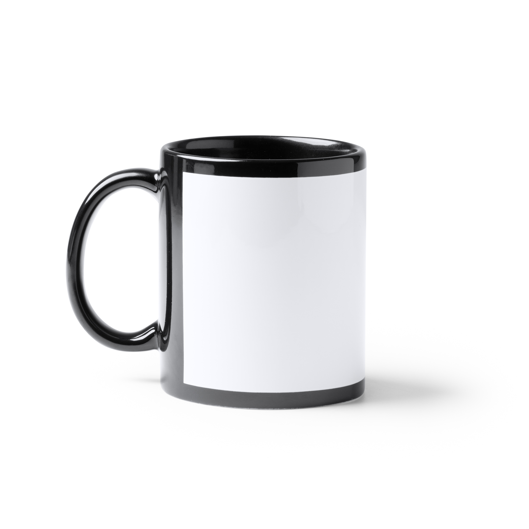 Taza negra de cerámica de 350ml con espacio en blanco diseñado especialmente para sublimación.