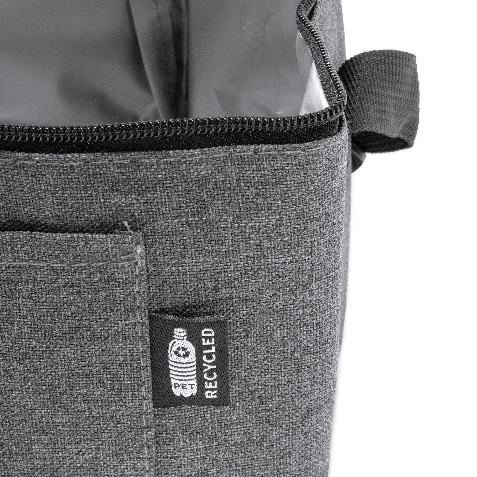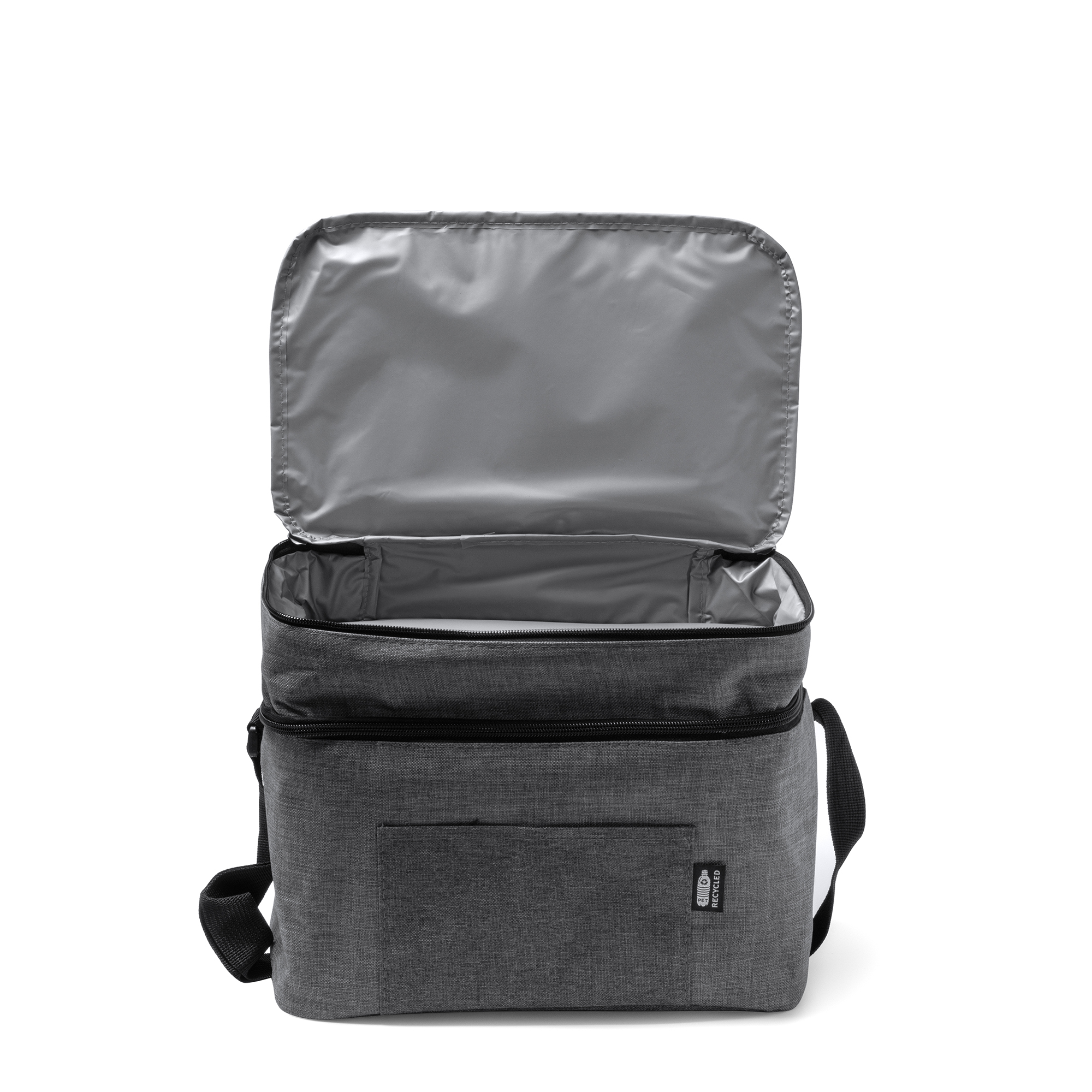 Nevera XL de poliéster reciclado RPET con diseño vigoré. Doble compartimento y bolsillo frontal para el almacenamiento de utensilios y alimentos más pequeños. Interior isométrico. Más capacidad, junto a su cinta ajustable, para llevar la comida y bebida de manera más cómoda.