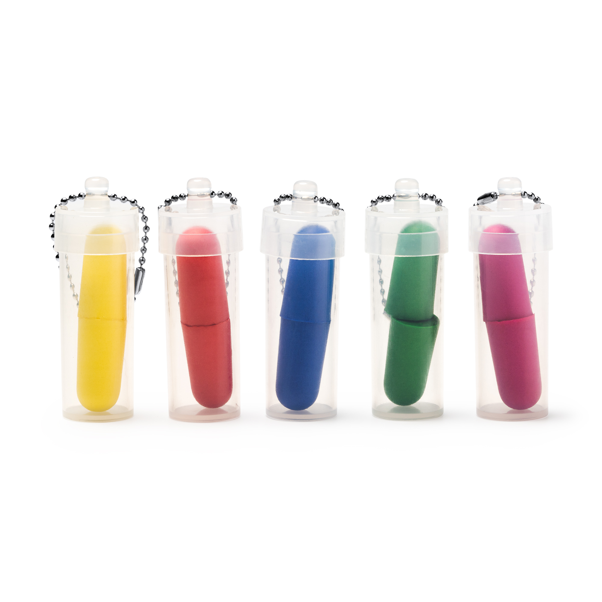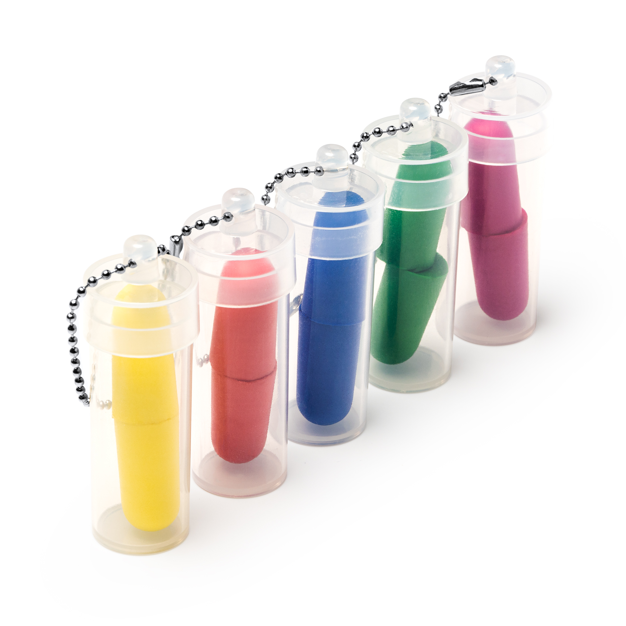 Tapones para oídos de EVA, lo que permite su adaptación a la morfología individual del usuario. Cuenta con un estuche transparente con cadena de transporte para su guardado.