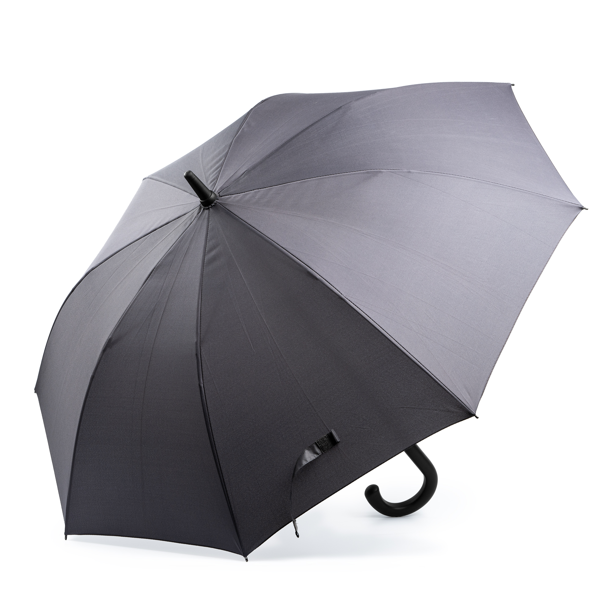 Paraguas realizado en tejido pongee 190T con mango en acabado suave. Apertura automática. Varillas de fibra de vidrio con sistema anti-viento y terminaciones reforzadas.