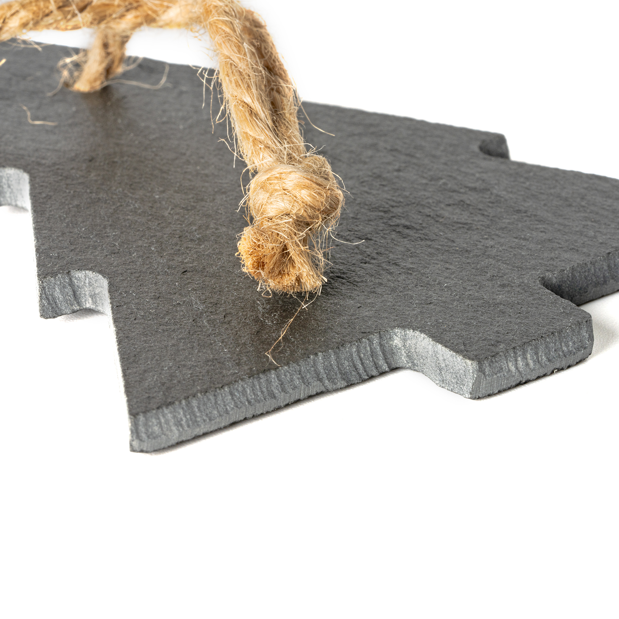 Adorno navideño de pizarra disponible en dos diseños: árbol y estrella. Incluye lazo para colgar en el árbol de navidad.