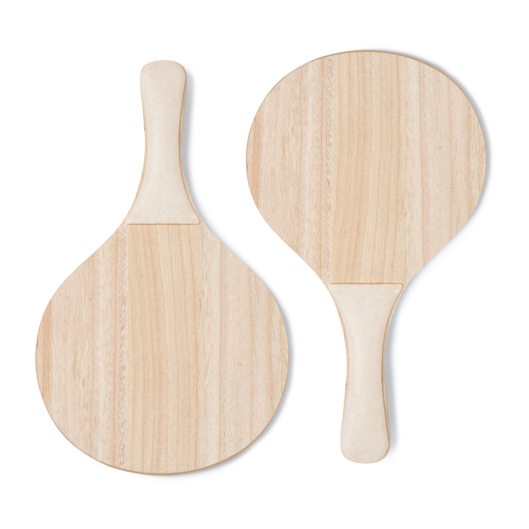Juego de palas de playa realizadas en madera y fibra de trigo. Integra en su superficie diferentes multijuegos: ajedrez y parchís, incluyendo las piezas de juego. Son una opción versátil y práctica, ya que te permite jugar a las palas de forma convencional o a los clásicos juegos de mesa.