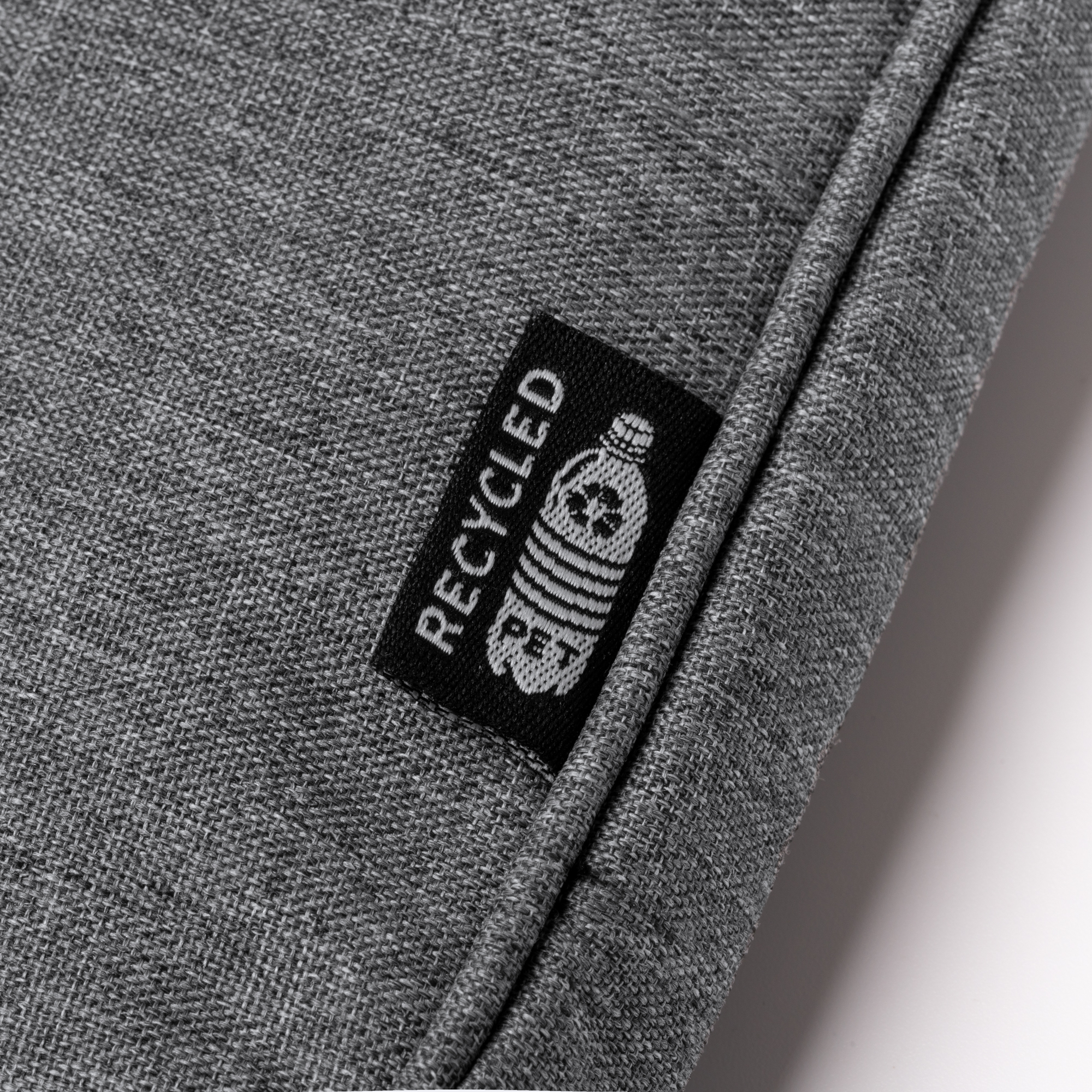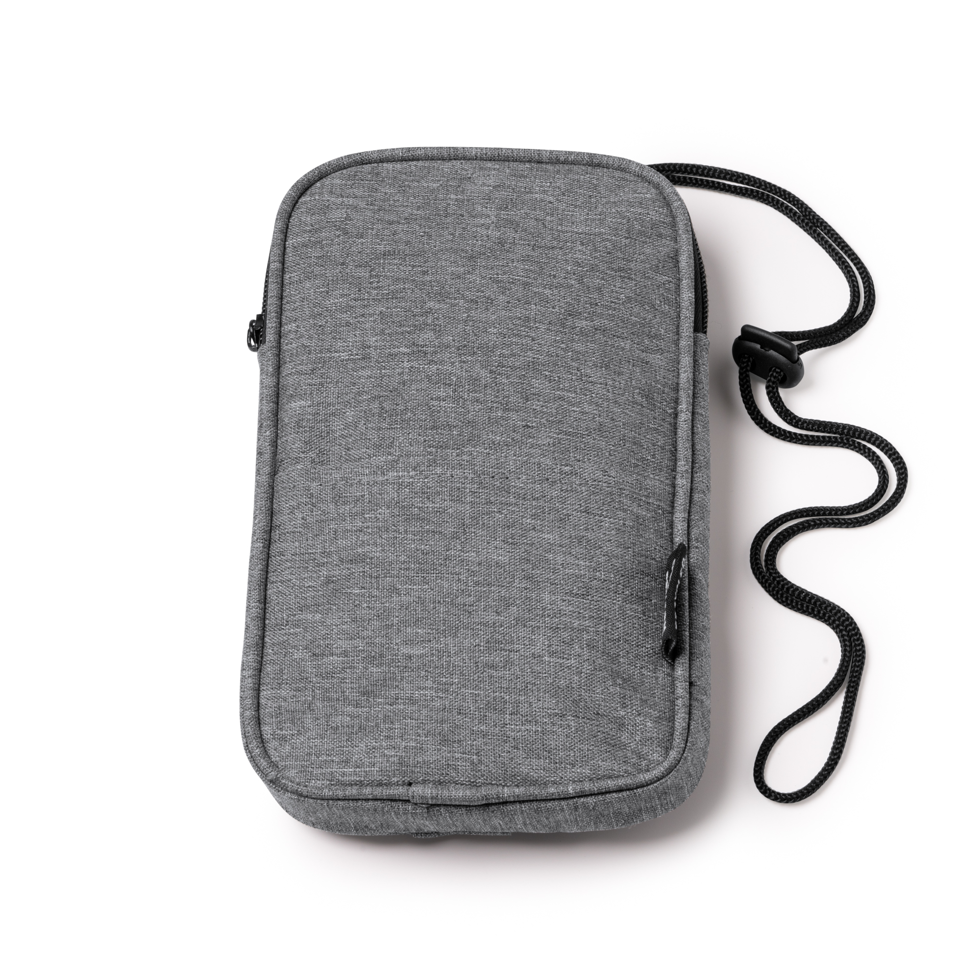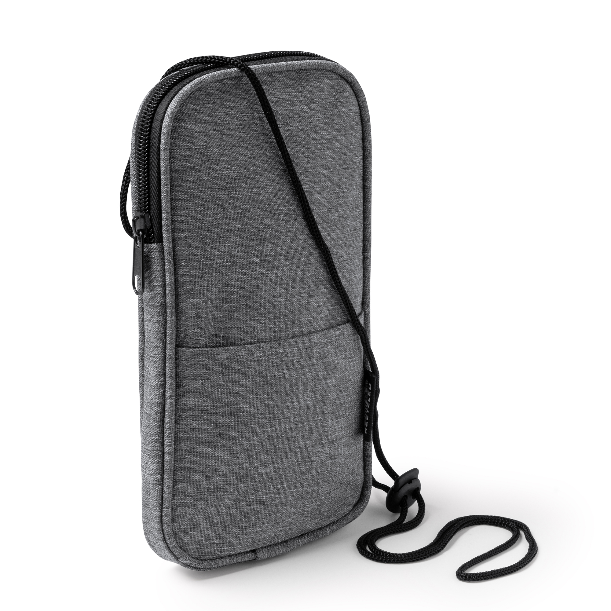 Portamóvil realizado en poliester reciclado RPET. Con un compartimento pricinpal con cierre de cremallera en negro. Cuenta con un bolsillo exterior e incluye cinta de transporte en negro. Una opción perfecta para el transporte de tu dispositivo y pequeños enseres.